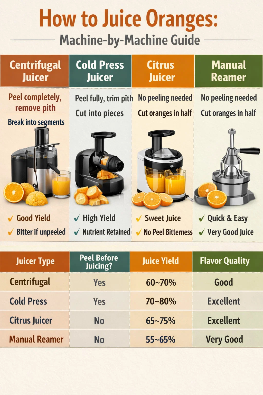 La confusion autour de cette question vient du fait que « presse-agrumes » signifie différentes choses pour différentes personnes. Un presse-agrumes centrifuge, un presse-agrumes à mastiquer pressé à froid, un alésoir à agrumes et une presse hydraulique traitent tous les oranges différemment. La machine posée sur votre comptoir détermine si vous épluchez en premier ou non – et une erreur ruinera votre jus, endommagera votre machine, ou les deux.