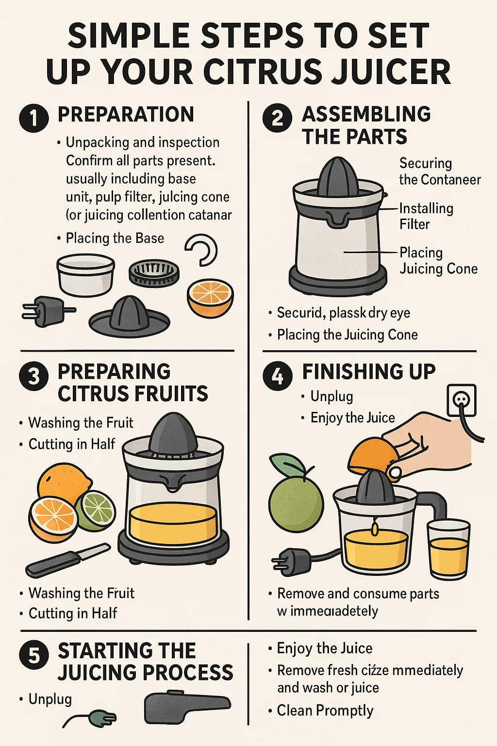 Placement de la base : placez l'unité de base du presse-agrumes sur une surface stable, sèche et non tremblante, comme un comptoir de cuisine. Assurez-vous que le cordon d’alimentation peut facilement atteindre une prise de courant.