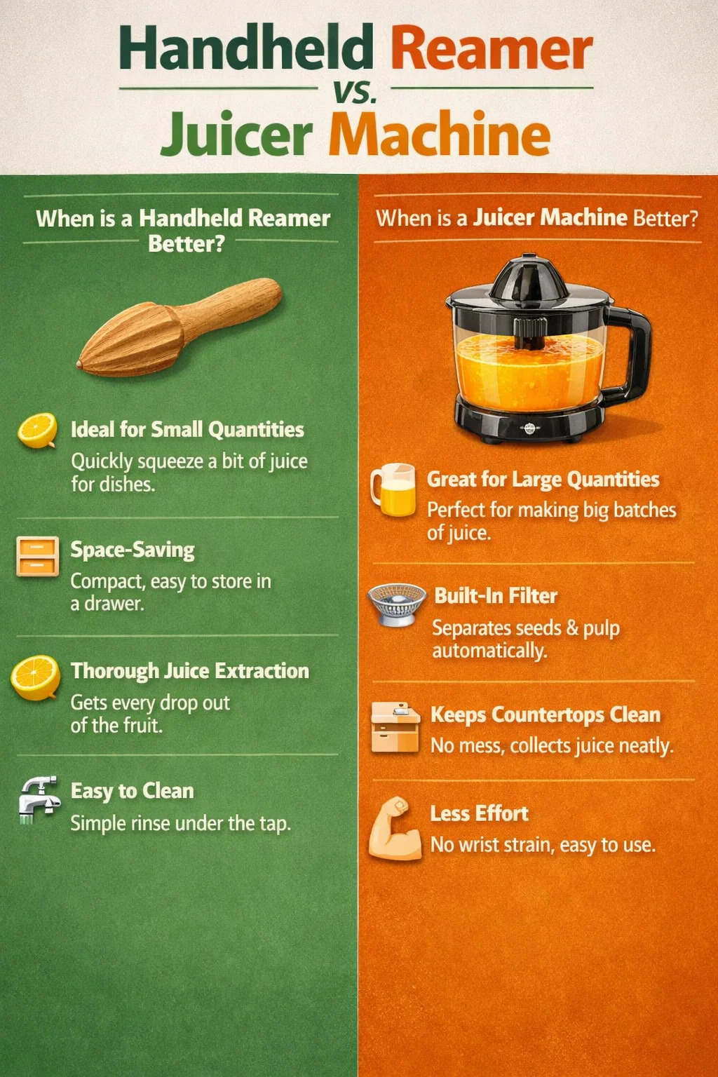 Dans la cuisine, est-il plus rentable d'utiliser un alésoir portatif ou un presse-agrumes avec un bol ou un moteur ? Il s’agit essentiellement d’un compromis entre « effort » et « efficacité ».