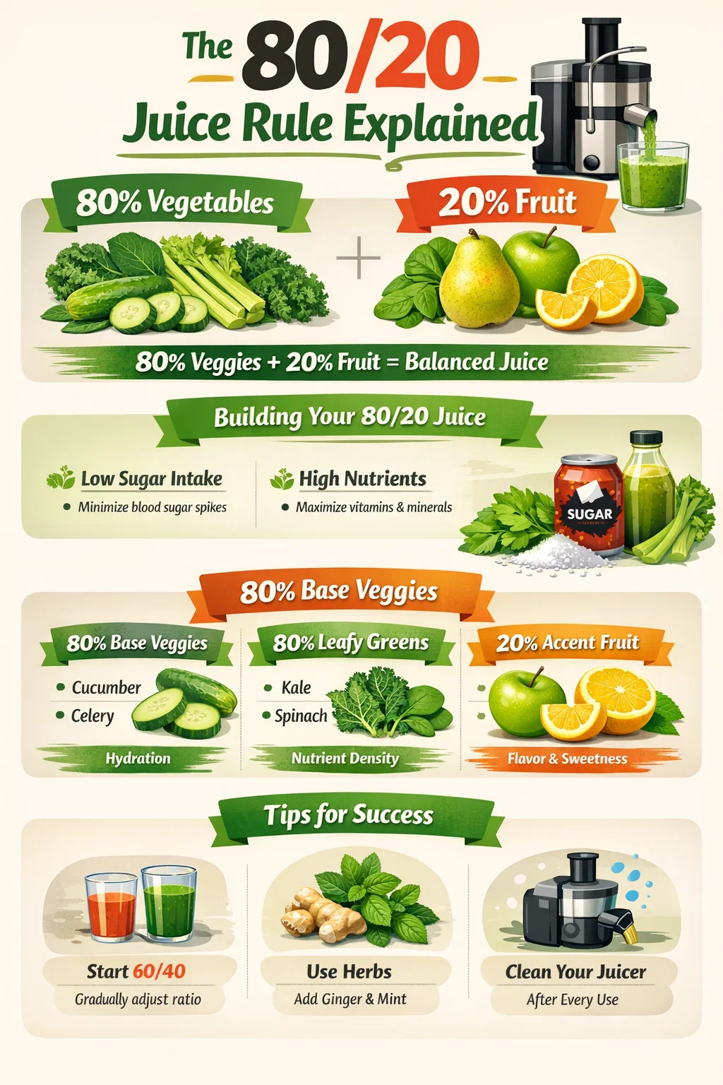 Le ultimate goal of the 80/20 rule is to turn your daily juice into a supplément riche en nutriments plutôt qu'une friandise sucrée. En utilisant votre presse-agrumes pour traiter un grand volume de légumes verts et aqueux, vous fournissez à votre corps une dose massive d’alcalinité et d’antioxydants. Cette approche soutient les objectifs de santé à long terme, aide à réduire l'inflammation et garantit que vous bénéficiez des véritables bienfaits médicinaux que les jus frais ont à offrir.
