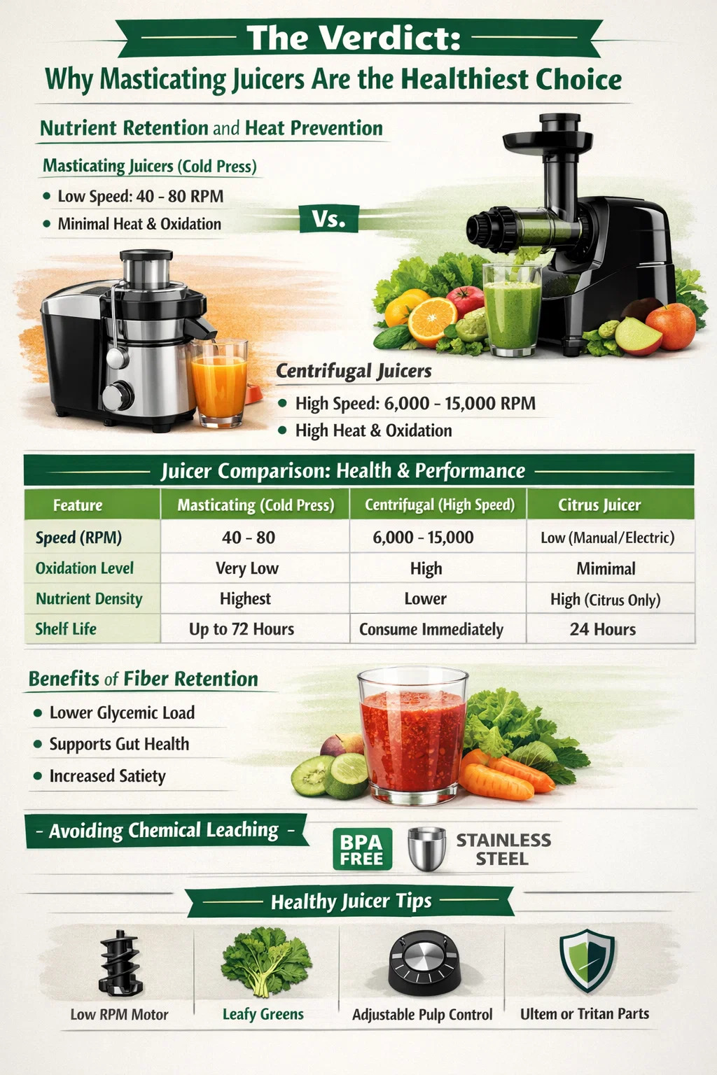En revanche, les centrifugeuses à mastication fonctionnent à une vitesse beaucoup plus faible, généralement entre 40 et 80 tr/min . Étant donné que le processus repose sur un pressage mécanique plutôt que sur un broyage à grande vitesse, la température du jus reste stable. La recherche indique que les jus pressés à froid peuvent contenir une quantité significative niveaux plus élevés de composés phytochimiques et d’antioxydants par rapport aux jus extraits par des méthodes à haute température.